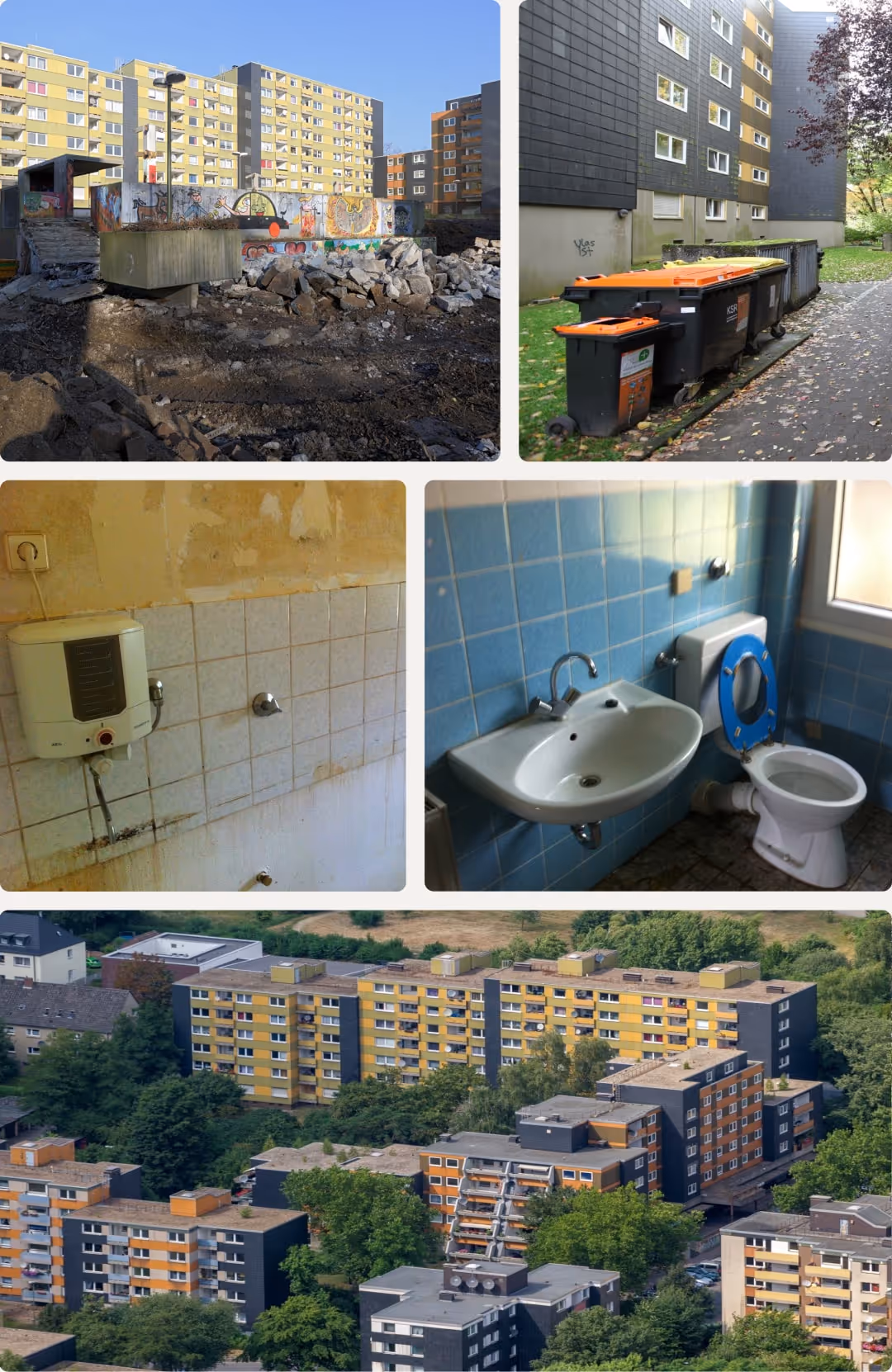 Was blieb, war eine heruntergekommene Hochhaussiedlung mit 369 Wohneinheiten, viel Beton und wenig Hoffnung. Die Fassade war grau, die Stimmung noch grauer. Die Mieter der ersten Stunde waren fast vollständig ausgezogen, dafür prägten zunehmender Leerstand, Lärm, Verschmutzung und ein spürbarer sozialer Abstieg das Bild.