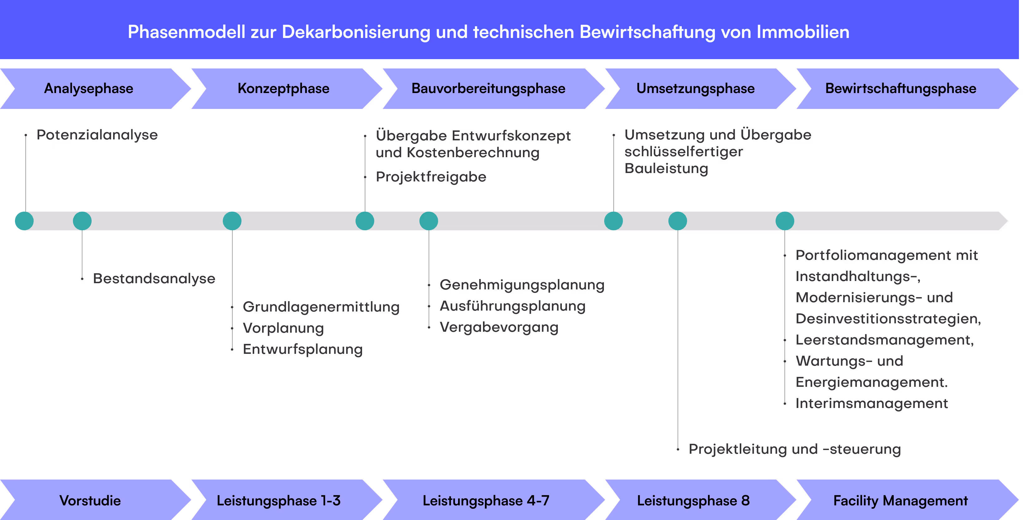 Das individuell konfigurierbare Gesamtpaket – für Unternehmen, die Dekarbonisierung, Wirtschaftlichkeit und soziale Verantwortung ganzheitlich steuern wollen. Pro vereint alle Leistungen aus Basis und Plus mit zusätzlicher strategischer, operativer und digitaler Tiefe über alle Phasen – von der Analyse bis zur Bewirtschaftung.